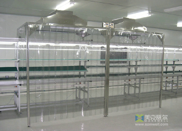 - 洁净棚:别名 :净化工作站、净化棚、无尘操作亭。洁净棚结构材料以钢方通喷塑作为框架,采用风机滤网机组FFU送风,四周围用防静电垂帘,顶部铺盖密缝盲板,形成一个密缝区,内部净化级别可达任何级别;特别适用于车间内局部净化级别要求高的区域,如流水线作业区域。高精确度产品组装区。