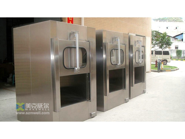 风淋式传递窗在传递物料时,顶部吹出高速、洁净气流,吹除货物表面的尘粒, 此时,两侧门可以打开也可关闭,洁净气流起到气闸作用,以保证洁净室室外的空气不会影响室内的洁净度。 传递窗的两侧门内侧边装有专用密封条,以确保传递窗的气密性。